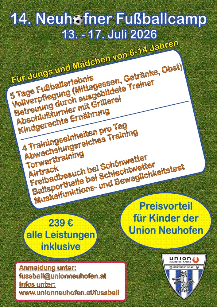 Jedes Jahr finden sich zahlreiche Jungs und Mädchen im Alter zwischen 6 und 14 Jahren aus Neuhofen und Umgebung ein, um sich dieses Ereignis in den Sommerferien nicht entgehen zu lassen. Wir freuen uns auch dieses Mal wieder auf bekannte und neue Gesichter, die die Fußballbegeisterung mit uns teilen. |
