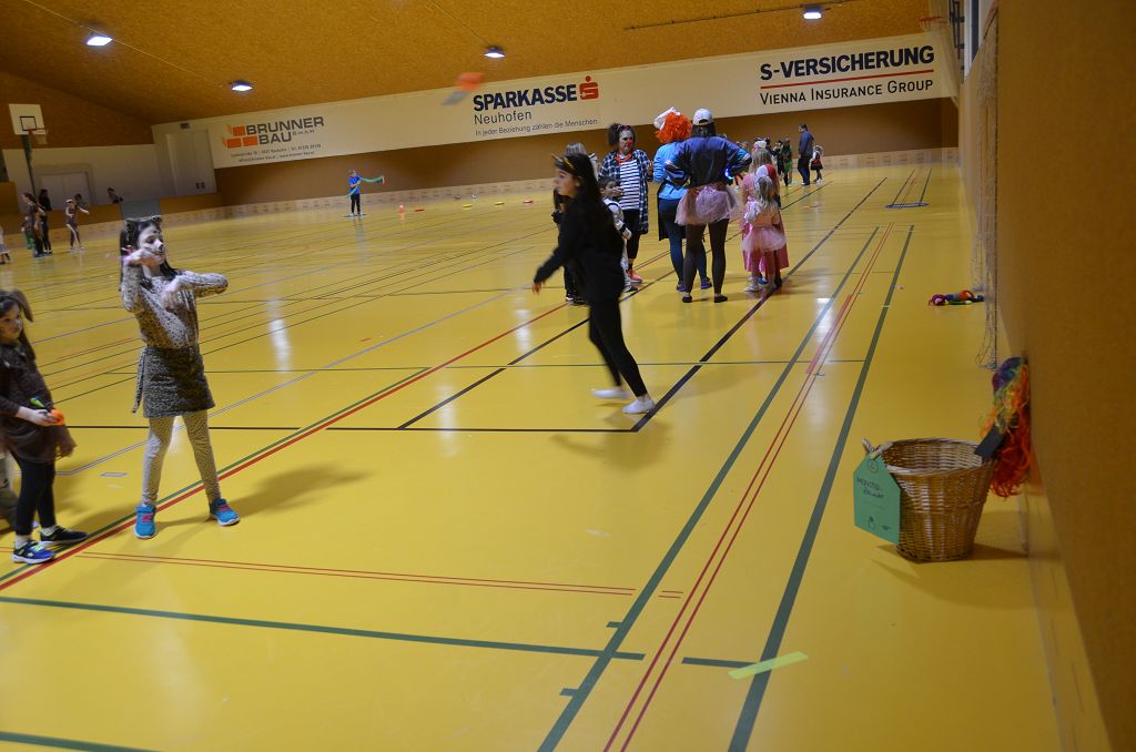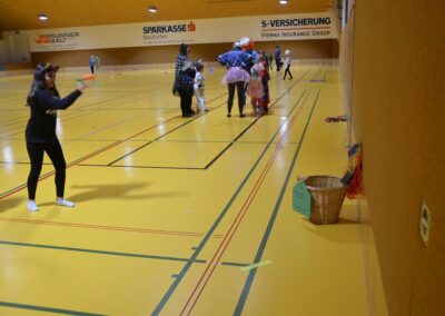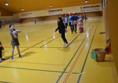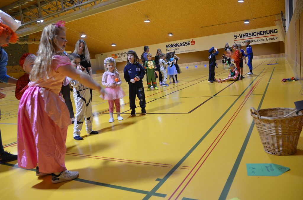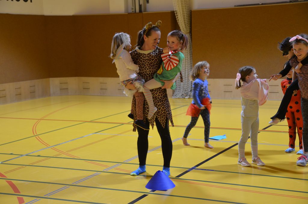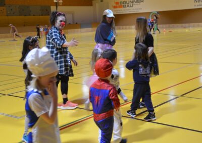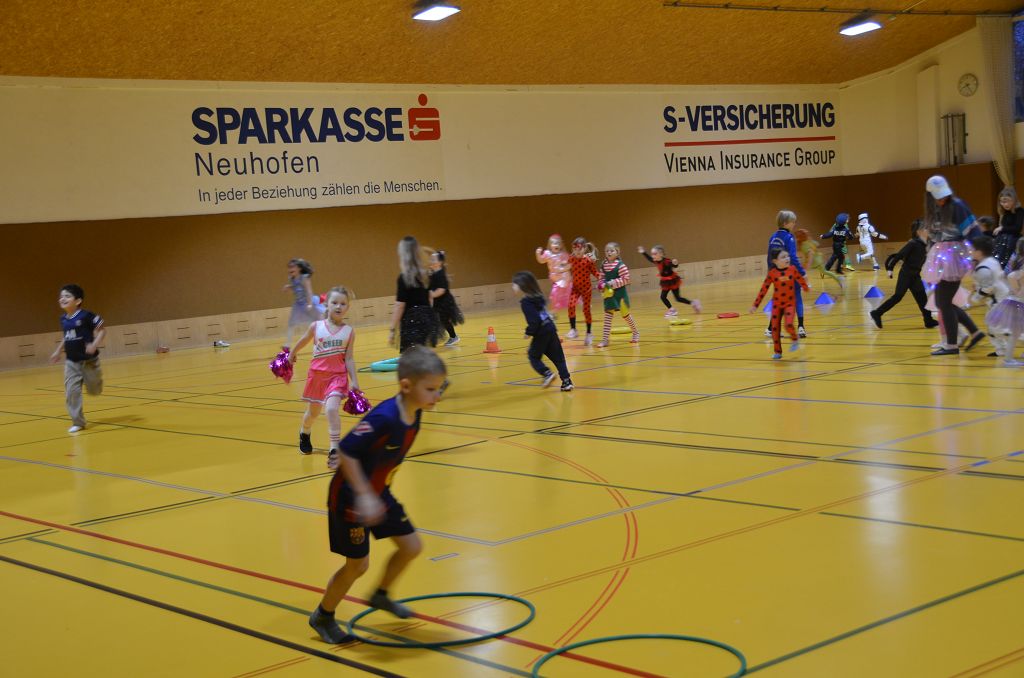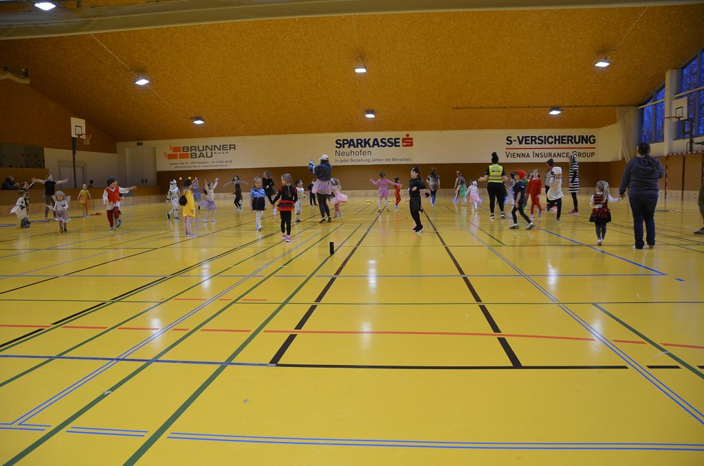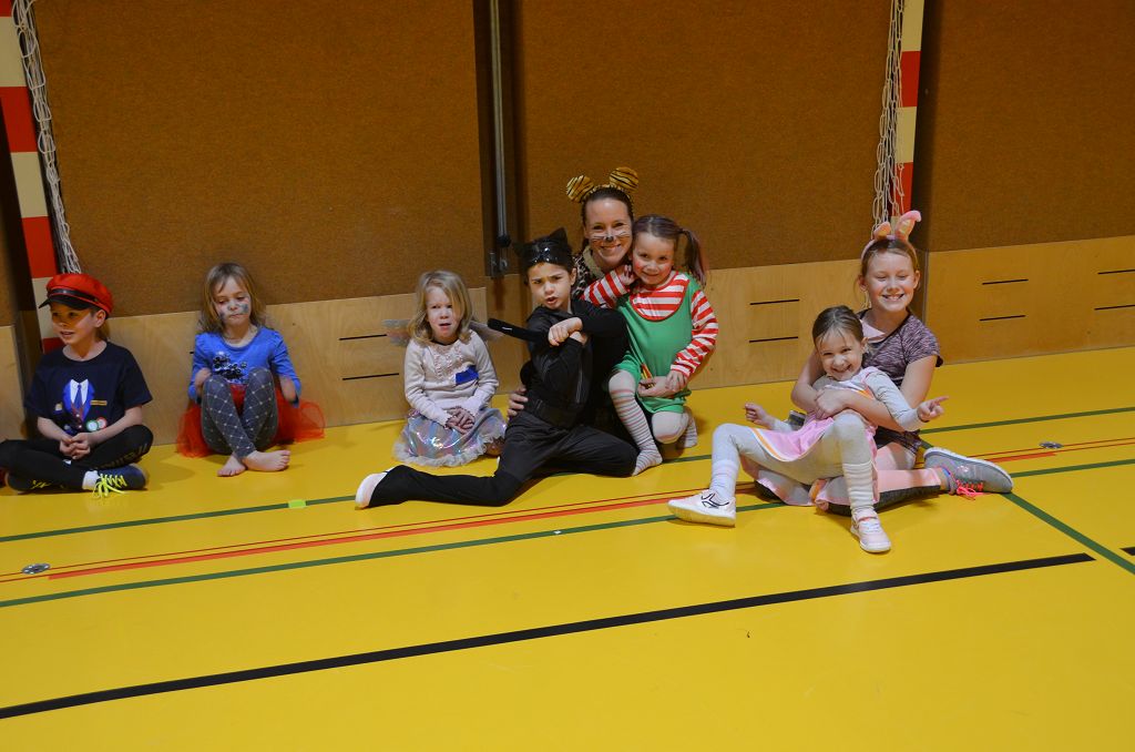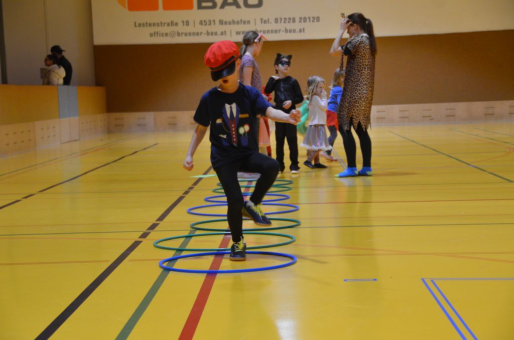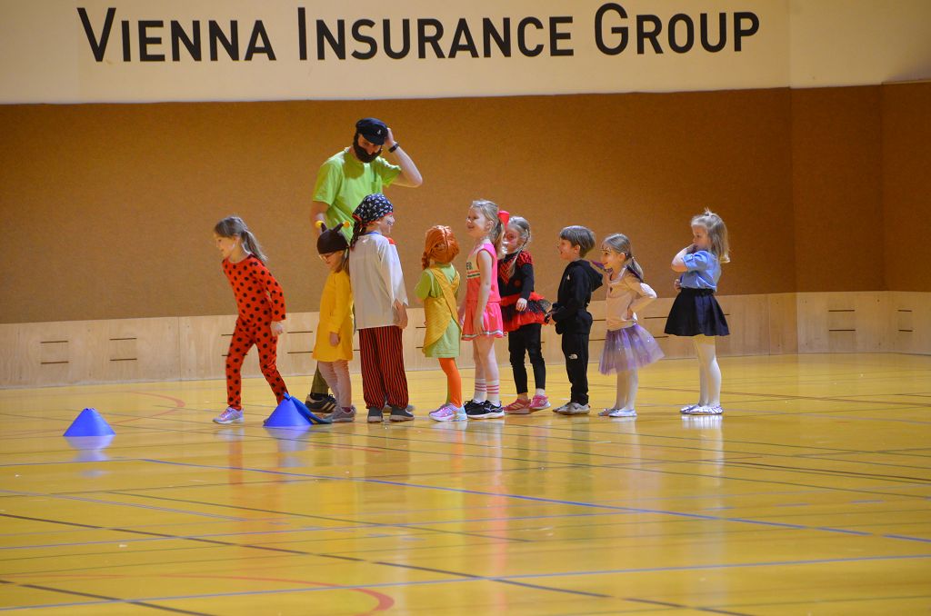 Nach einer bunten Faschingsparade besuchten die lustigen und interessanten Gestalten in kleineren Gruppen die verschiedene Stationen im „Faschingsabenteuerland“. Man durfte über den Prinzessinen- und Ritterpfad balancieren, einem Heulermonster Heuler in den Zielkorb werfen, sich in einem Krapfenstaffellauf messen, einem Drachen im Slalomlauf geschickt ausweichen und im Känguru-Sprungland seine Sprungkünste vorführen. Zum Abschluss sausten die superschnellen Faschingskinder zum Krapfenkreis,und schnappten sich ein Krapfenbild, welches gegen einen echten Faschingskrapfen eingetauscht wurde – und den haben sich alle wirklich verdient! Ihr wart toll, danke,dass ihr mit so viel Spaß dabei wart, liebe Kinder und liebes Trainingsteam!